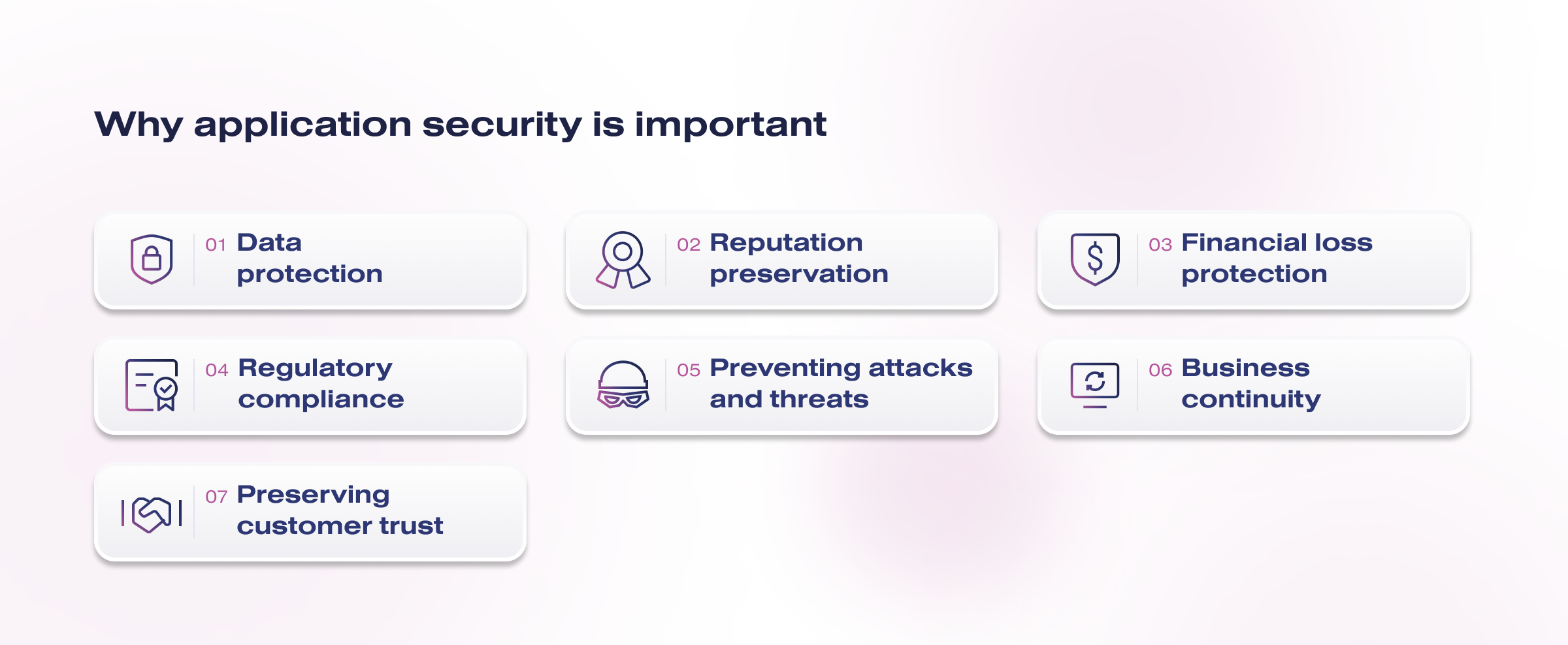 - Preventing attacks and threats. Application security not only protects against current threats but also prevents future attacks. By actively strengthening security, vulnerabilities can be detected and addressed before attackers exploit them.