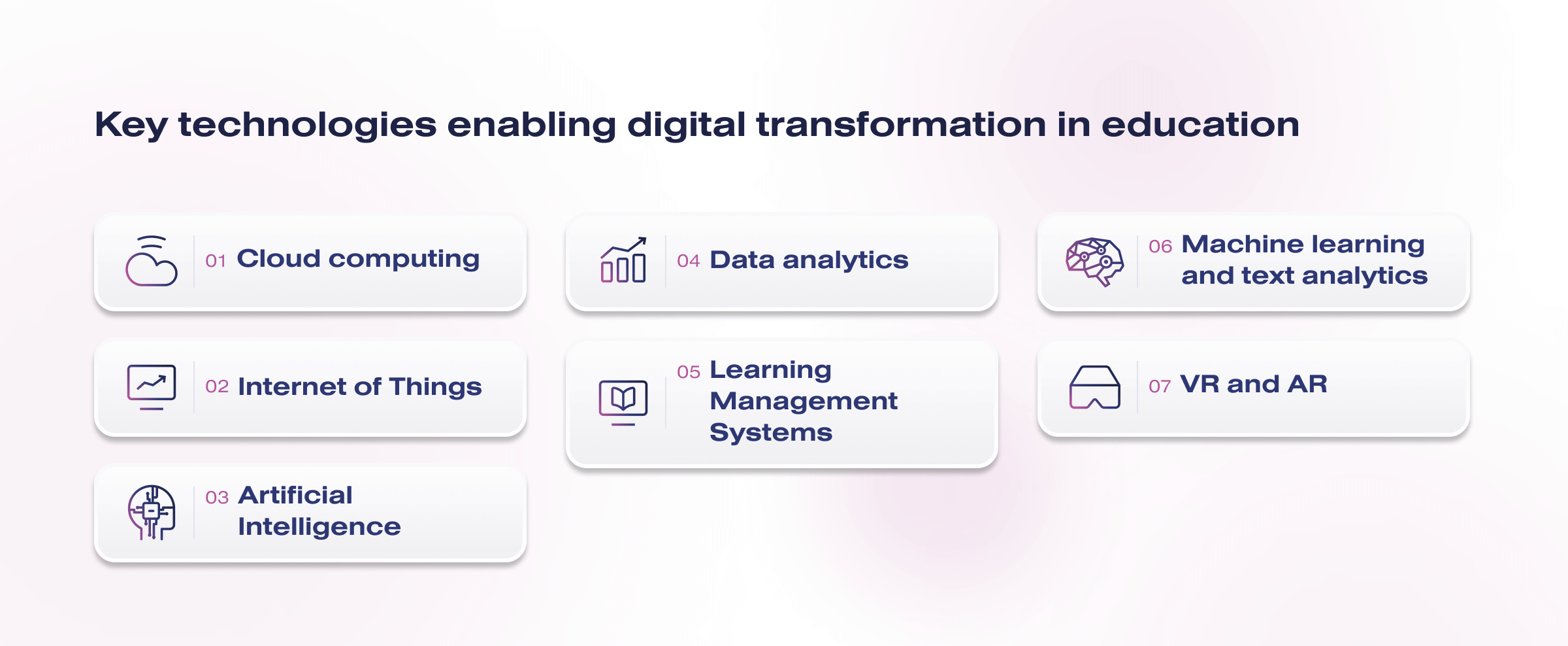 Digital transformation in education relies on various technologies changing how we learn and manage learning processes. Here are some of the key technologies playing an important role in this process: