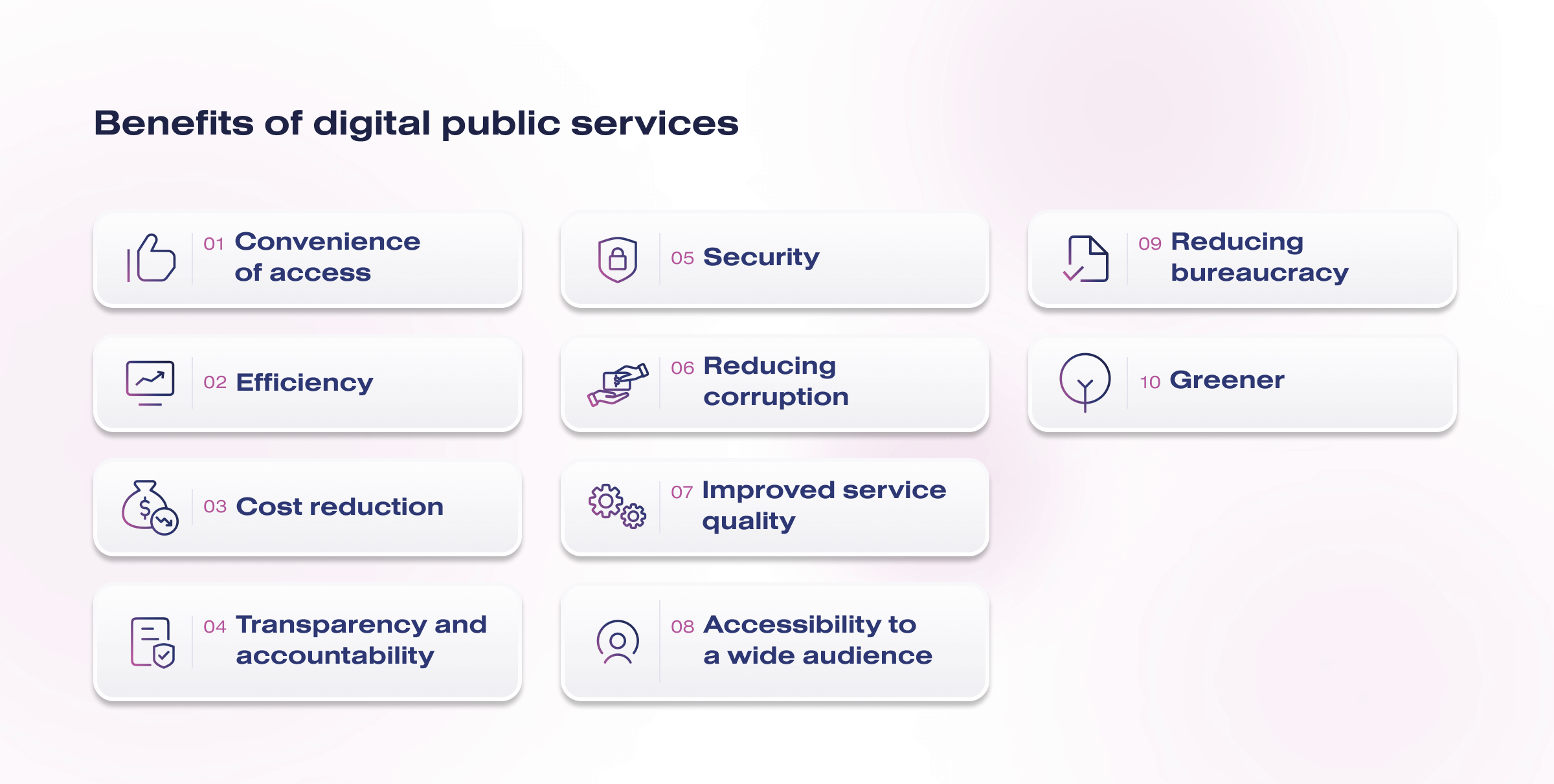 - Efficiency. Digital services can be processed and executed faster and more efficiently than traditional paper-based processes. This reduces bureaucratic delays and improves service.
