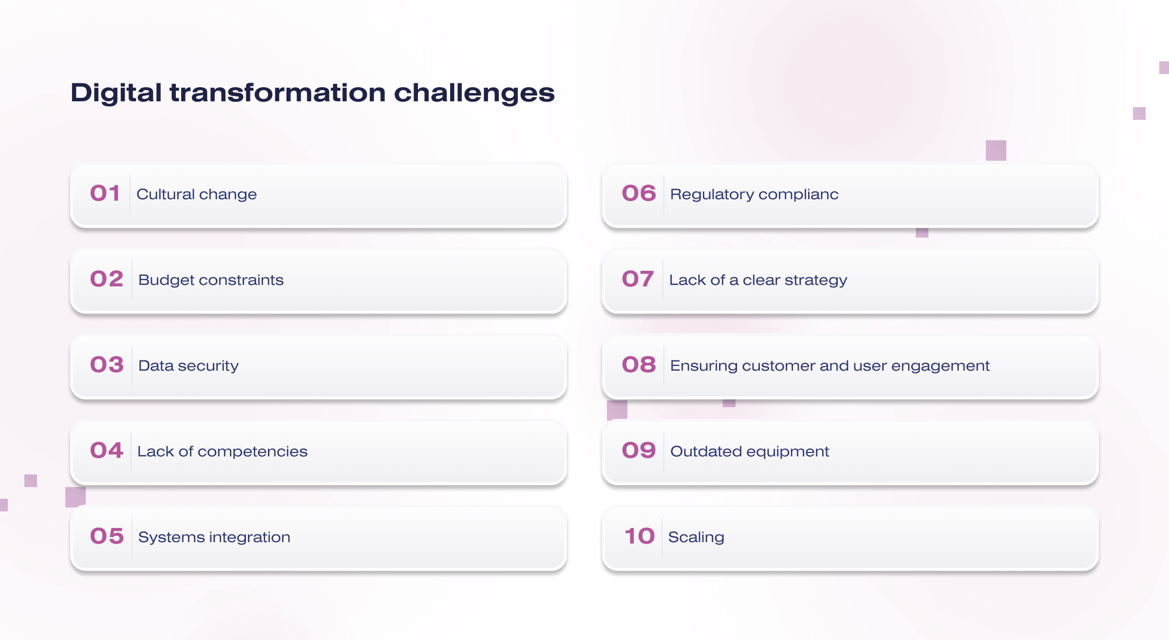 Successful digital transformation requires considering these challenges and developing strategies and solutions to overcome them.