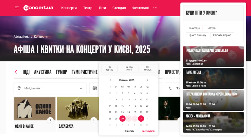 Concert.UA is an online platform that allows you to buy tickets for various music events, concerts, festivals, and other cultural events online. You can also order tickets for theater performances, exhibitions, etc.