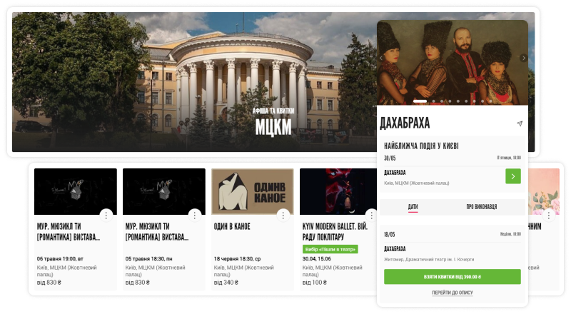 This service allows you to quickly and conveniently find current events in different cities of Ukraine and buy tickets online in a comfortable way via the Internet.